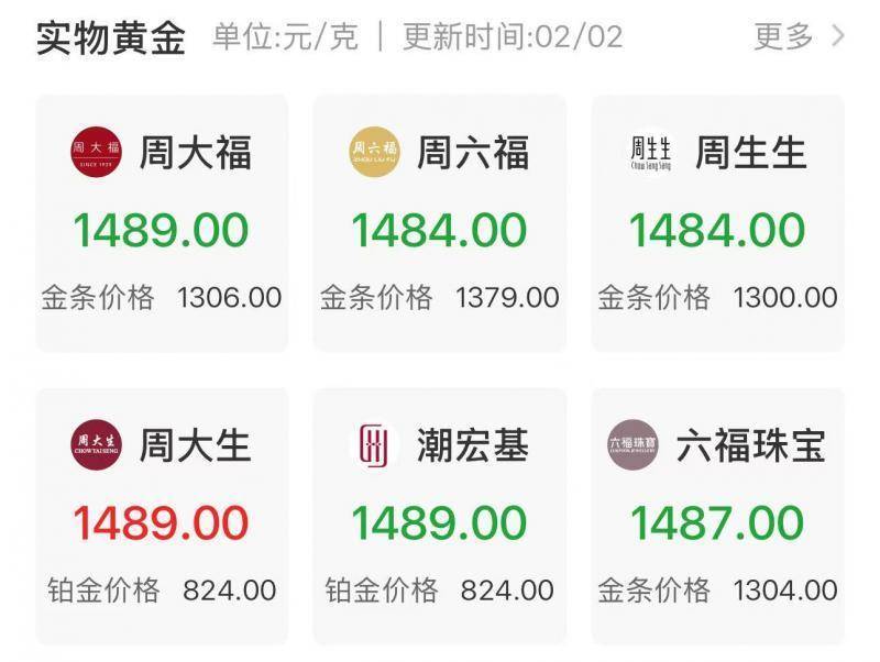 国内黄金品牌金饰价格方面,2月2日,周生生足金饰品价格为1484元/克,较1月29日(国际金价创历史新高日)下降224元;周六福足金饰品价格1484元/克,较1月29日下降217元/克;周大福足金价格为1489元/克,较1月29日跌217元/克;老庙足金饰品价格为1509元/克,较1月29日跌217元/克。