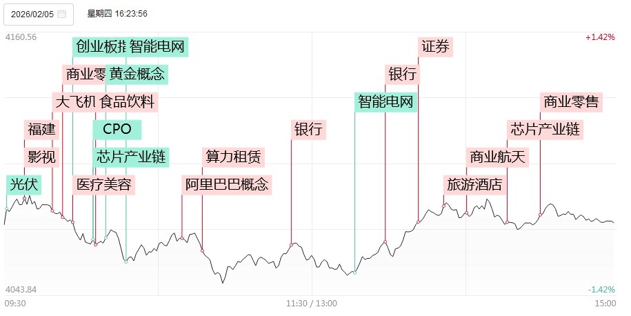 2月5日,三大指数午后跌幅收窄,此前一度跌超1%,北证50指数跌超2%。沪深两市成交额2.18万亿,较上一个交易日缩量3048亿。截至收盘,沪指跌0.64%,深成指跌1.44%,创业板指跌1.55%。盘面上,全市场超3700只个股下跌,57只股涨停。从板块来看,大消费板块大涨,食品饮料、零售、影视院线、旅游酒店方向轮番活跃,横店影视6天5板,杭州解百2连板,安记食品、海欣食品、金逸影视、三峡旅游涨停。大金融板块午后走强,华林证券、厦门银行涨停。商业航天概念局部活跃,神剑股份3天2板。算力租赁概念回暖,群兴玩具4天2板,二六三封涨停。下跌方面,有色金属、电网设备、油气等板块跌幅居前。其中贵金属概念集体大跌,湖南白银跌停。