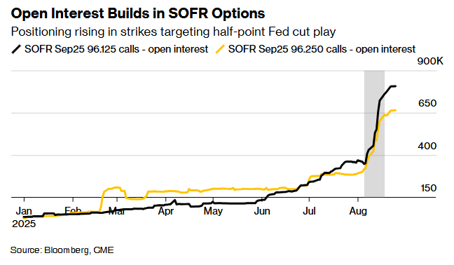 与此同时,对与美联储政策预期高度相关的有担保隔夜融资利率(SOFR)鸽派头寸的需求继续上升。交易员加大了这一押注,未平仓合约在针对美联储下月降息50个基点的执行价上大幅增加。然而,利率掉期数据显示,市场目前预计美联储在下月降息25个基点的概率为84%,剩余概率则倾向于维持不变。