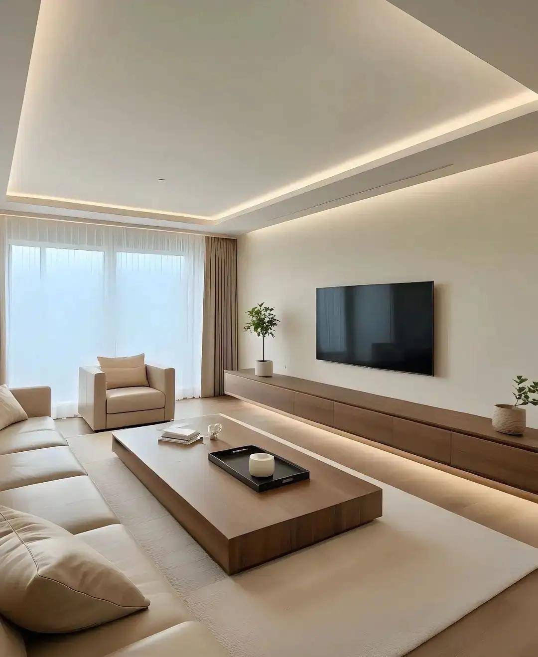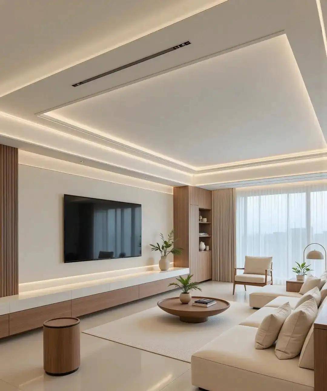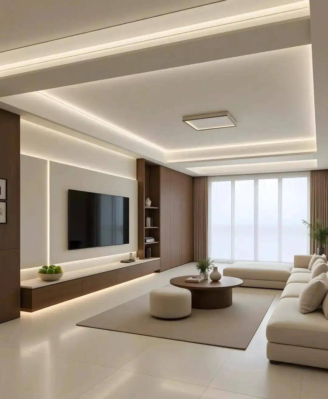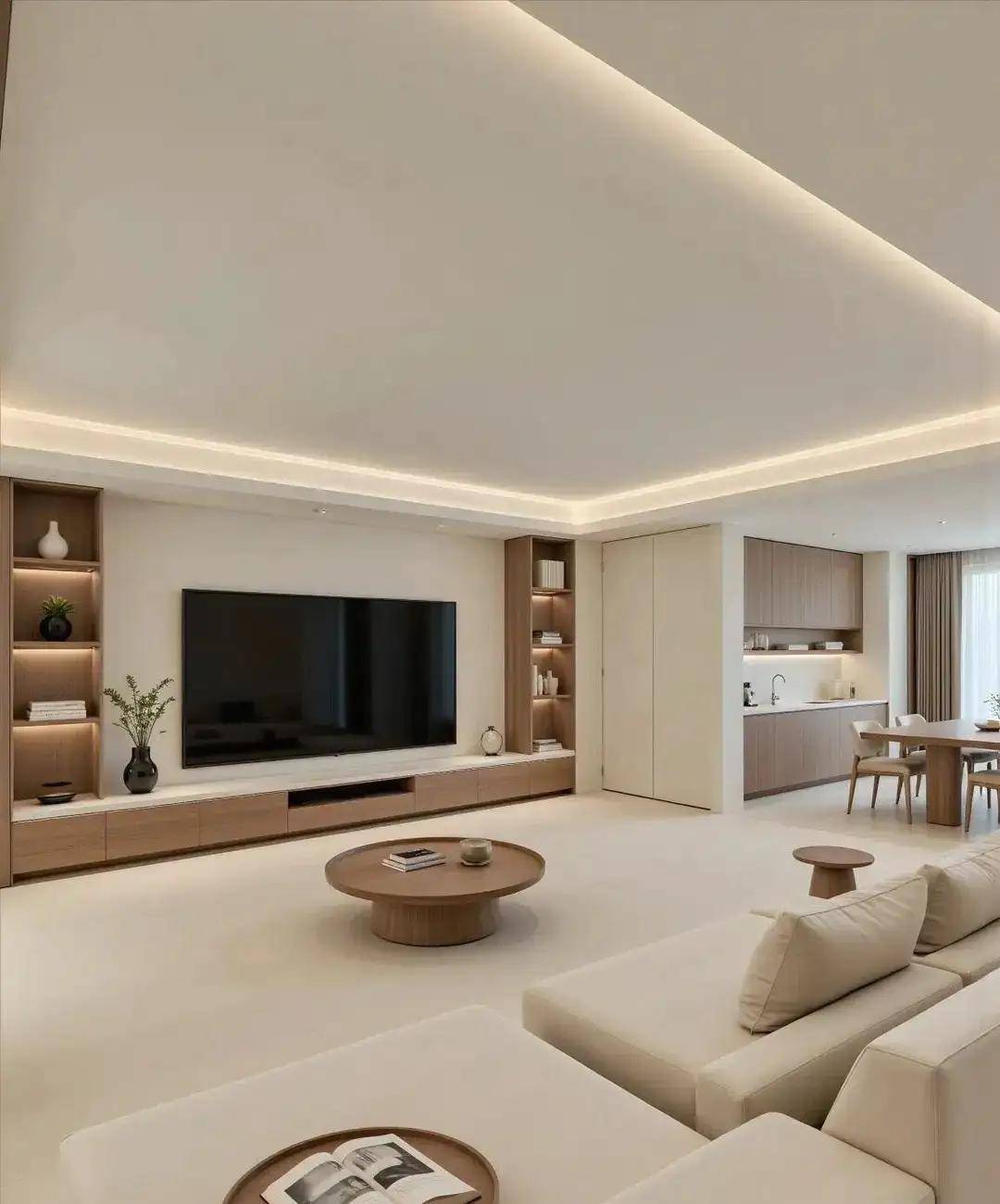 3. 小细节搭配,让定制柜质感翻倍小林家的电视墙定制柜,柜门全是奶白色,只在侧边做了一列浅灰色开放格,还装了暖光灯带。