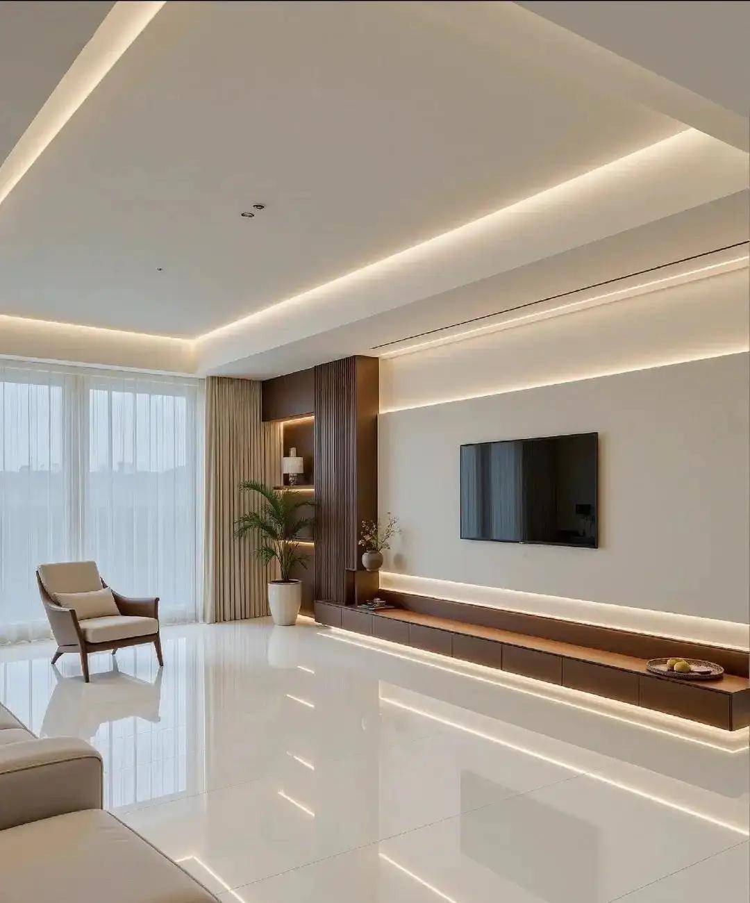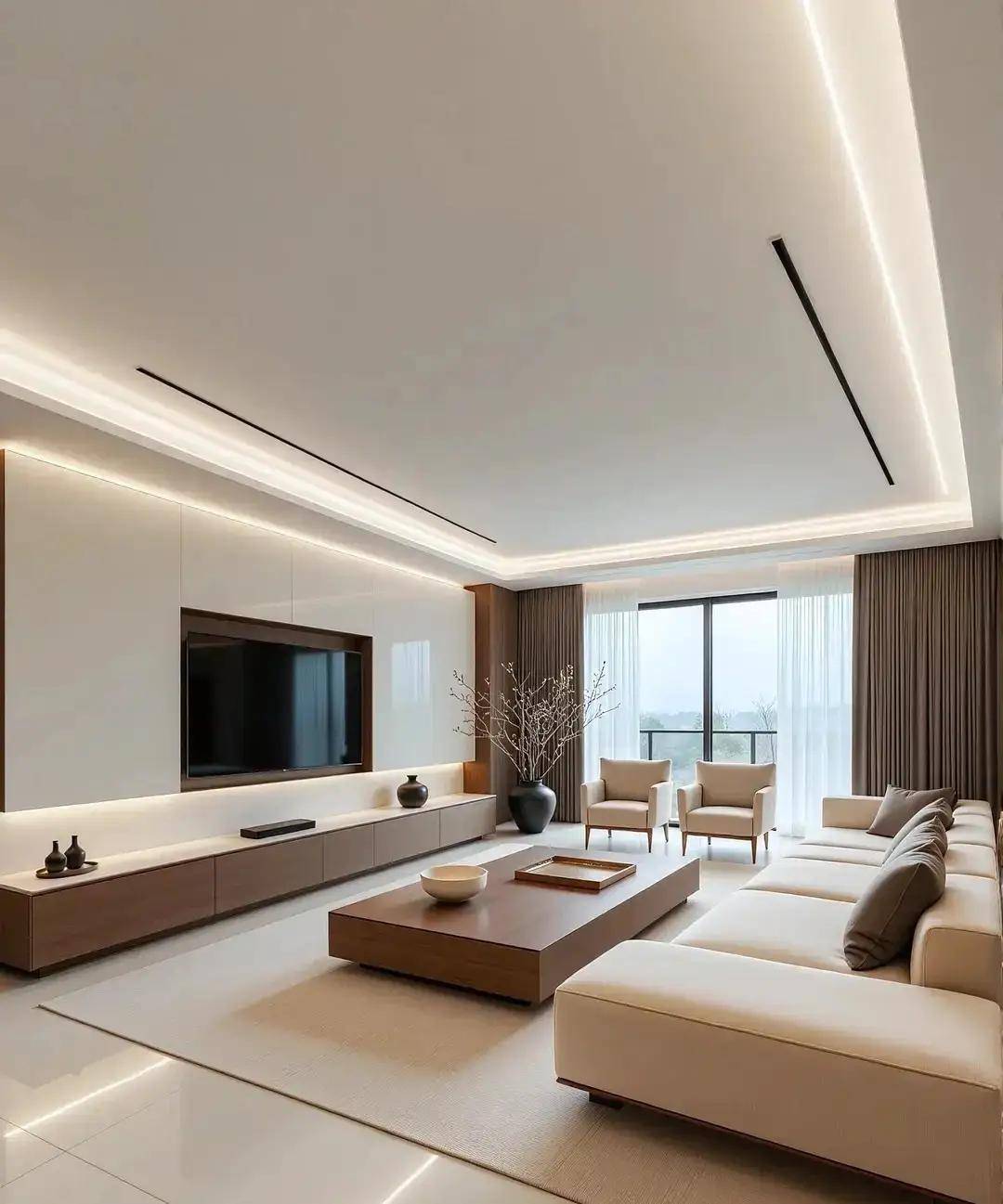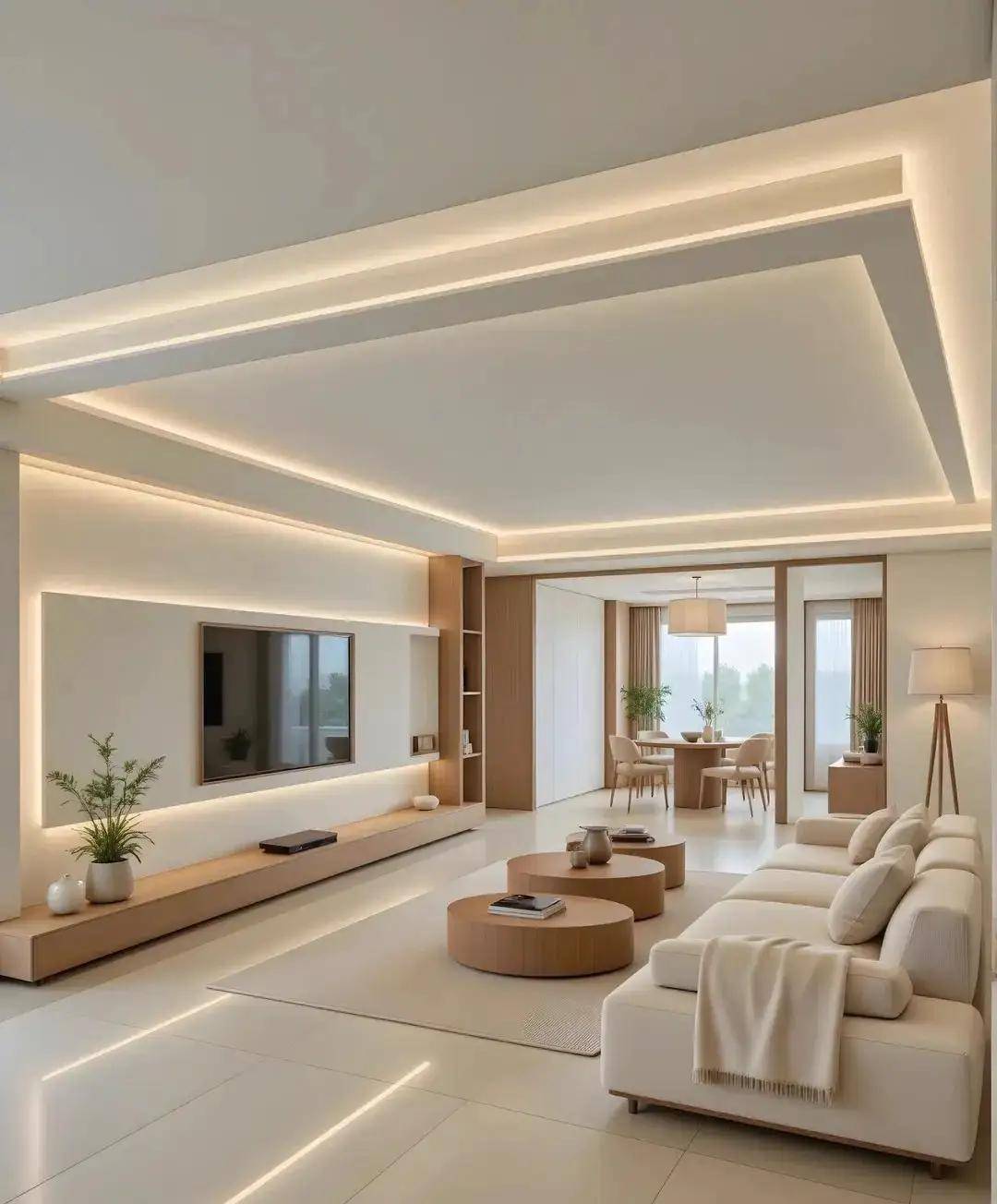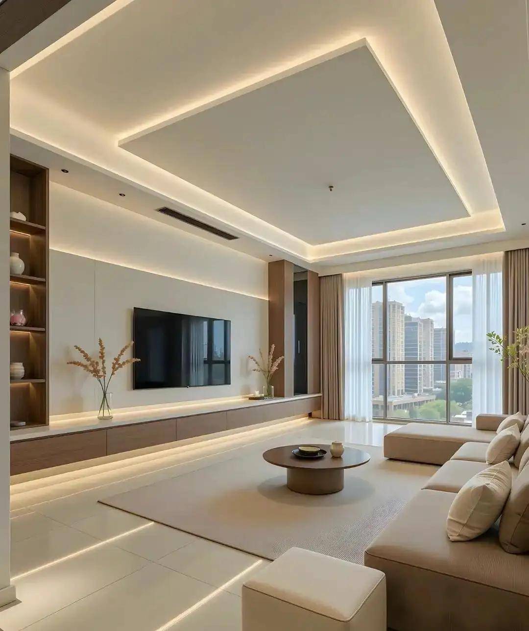 3. 小细节搭配,让定制柜质感翻倍小林家的电视墙定制柜,柜门全是奶白色,只在侧边做了一列浅灰色开放格,还装了暖光灯带。