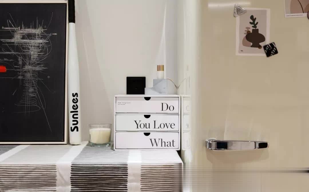进门左手定制顶天立地收纳柜,兼顾收纳与鞋柜功能;楼梯下方打造收纳柜,利用高度差布局冰箱,剩余空间放置小餐桌,满足一人就餐。