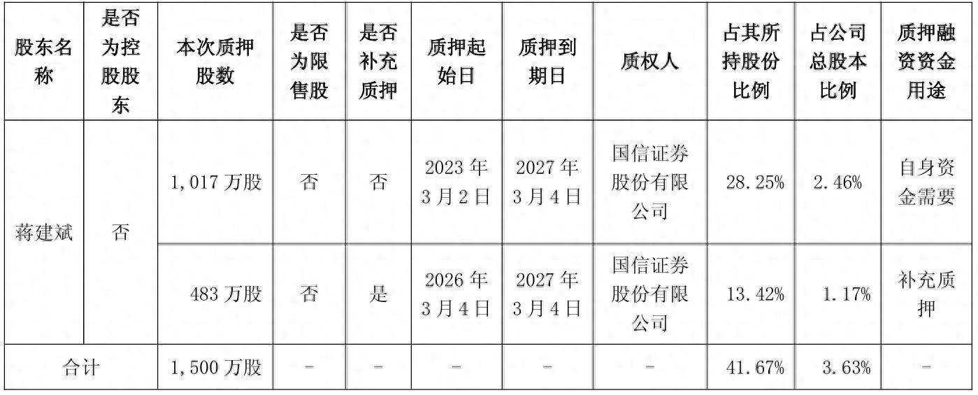 公告显示,本次质押为蒋建斌先生对前期质押股份的延期购回及补充质押,不涉及新增融资安排。截至公告披露日,蒋建斌累计质押股份为1500万股,占其持股的41.67%及公司总股本的3.63%。