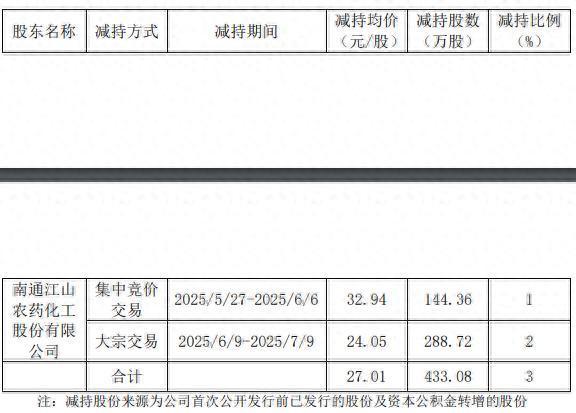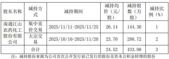 2月12日,江天化学(300927)发布公告称,持股9.02%的股东江山股份计划2026年3月17日至6月16日通过集中竞价或大宗交易减持不超过433.08万股,占公司总股本3.00%,其中集中竞价不超过144.36万股,大宗交易不超过288.72万股。持股来源为IPO前取得及资本公积金转增股本。