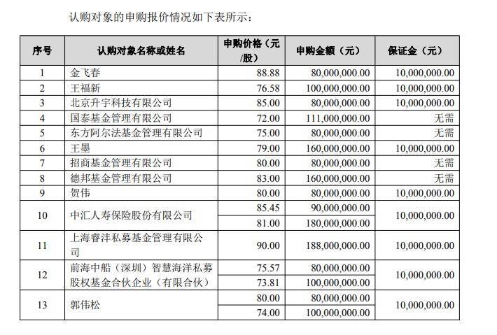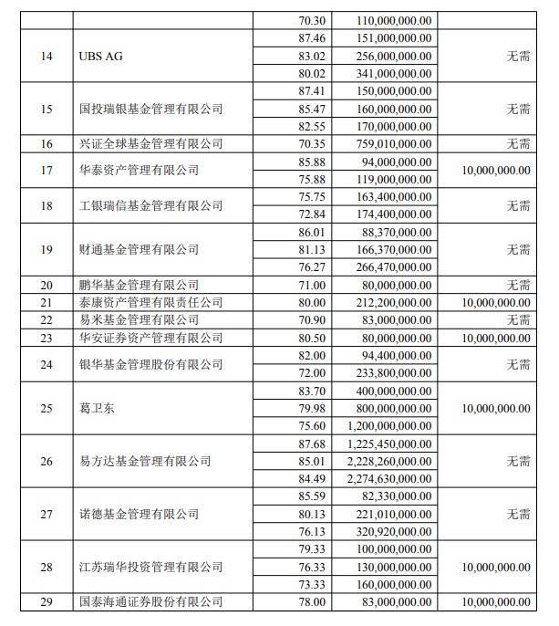 从申购报价情况来看,易方达基金、兴证全球基金、鹏华基金等公募机构以及UBS AG(瑞银)、中汇人寿保险等外资和险资,以及知名投资人葛卫东均参与其中。其中,葛卫东申购总金额为24亿元。