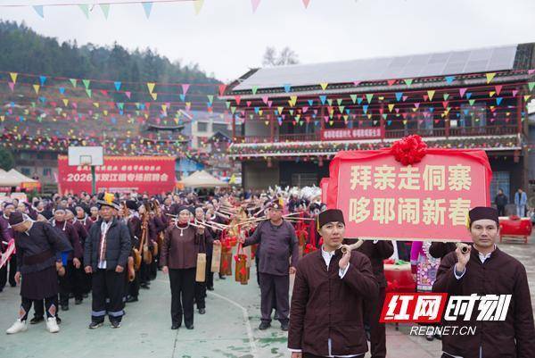 红网时刻新闻2月18日怀化讯(通讯员 龙开春 吴师亚 肖化冰)2月18日,农历正月初二,通道侗族自治县双江镇竹塘村举办“拜年多耶闹新春”主题文化活动。村民们身着盛装,以“走亲年”“多耶闹春”等传统民俗,共庆新春佳节,外村亲戚特别是外嫁姑巴们及游客共计1500余人参与。