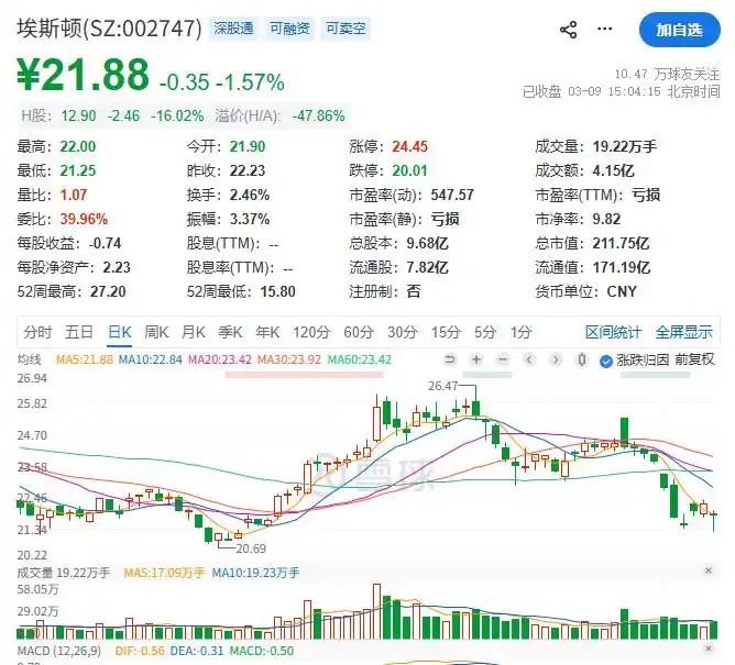 3月9日,埃斯顿A股收盘跌1.57%,报21.88元/股,较H股大幅溢价47.85%。