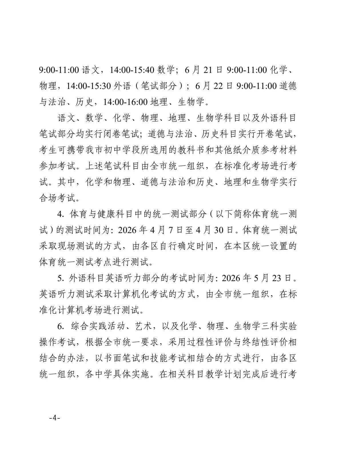 规定明确,学业水平考试笔试科目的考试时间为:2026年6月20日9:00-11:00语文,14:00-15:40数学;6月21日9:00-11:00化学、物理,14:00-15:30外语(笔试部分);6月22日9:00-11:00道德与法治、历史,14:00-16:00地理、生物学。